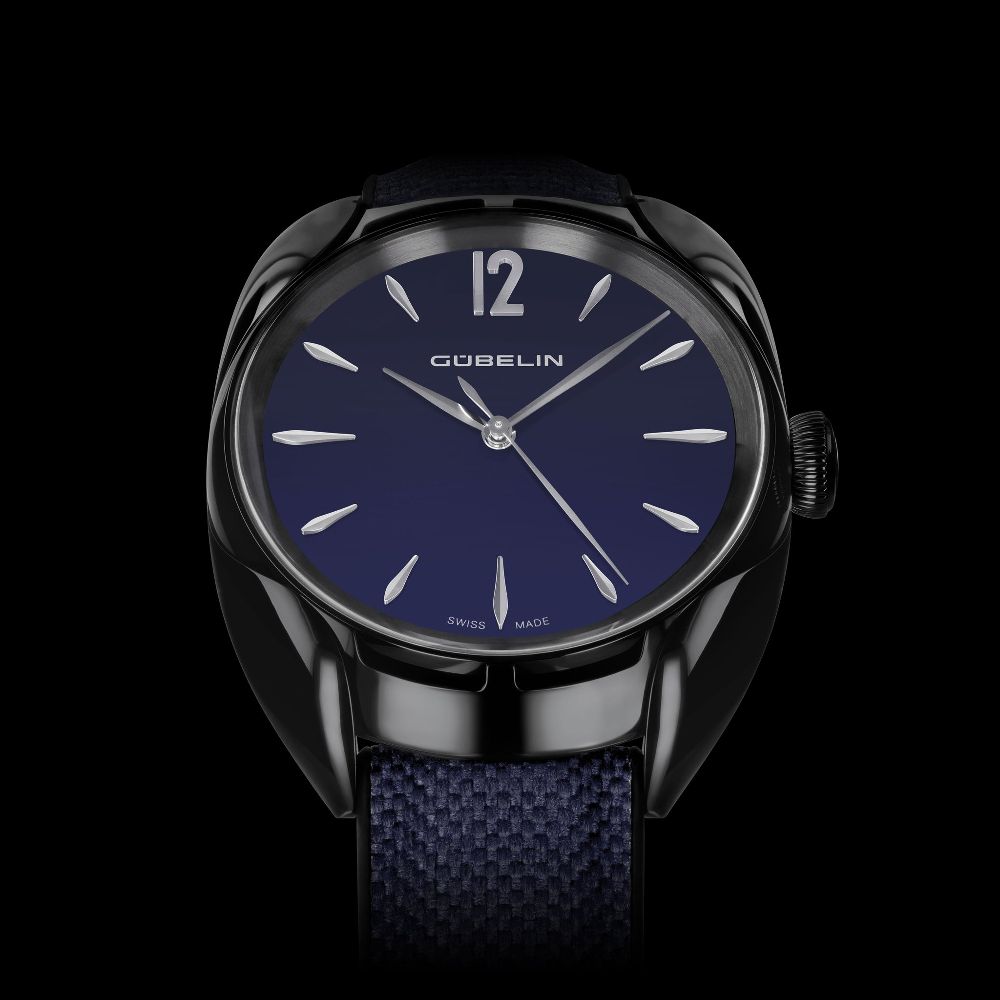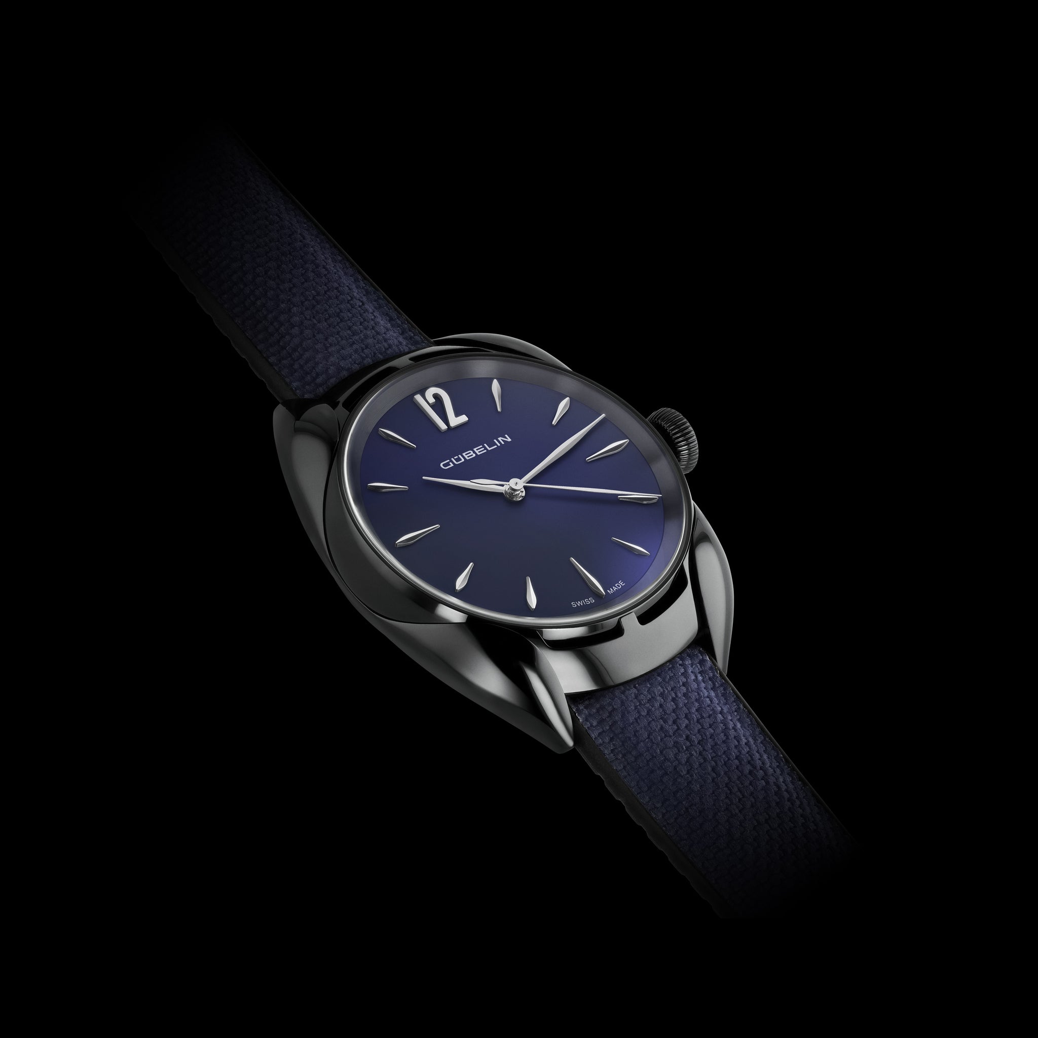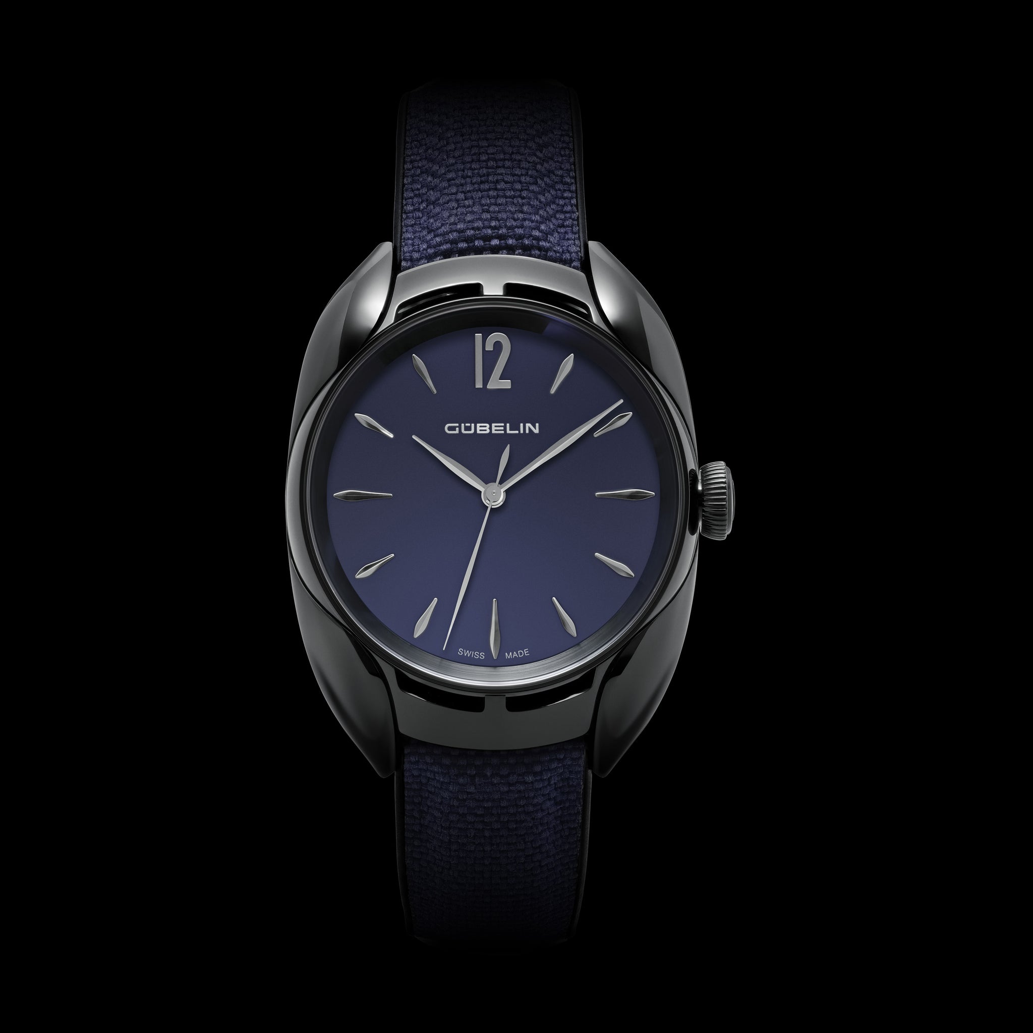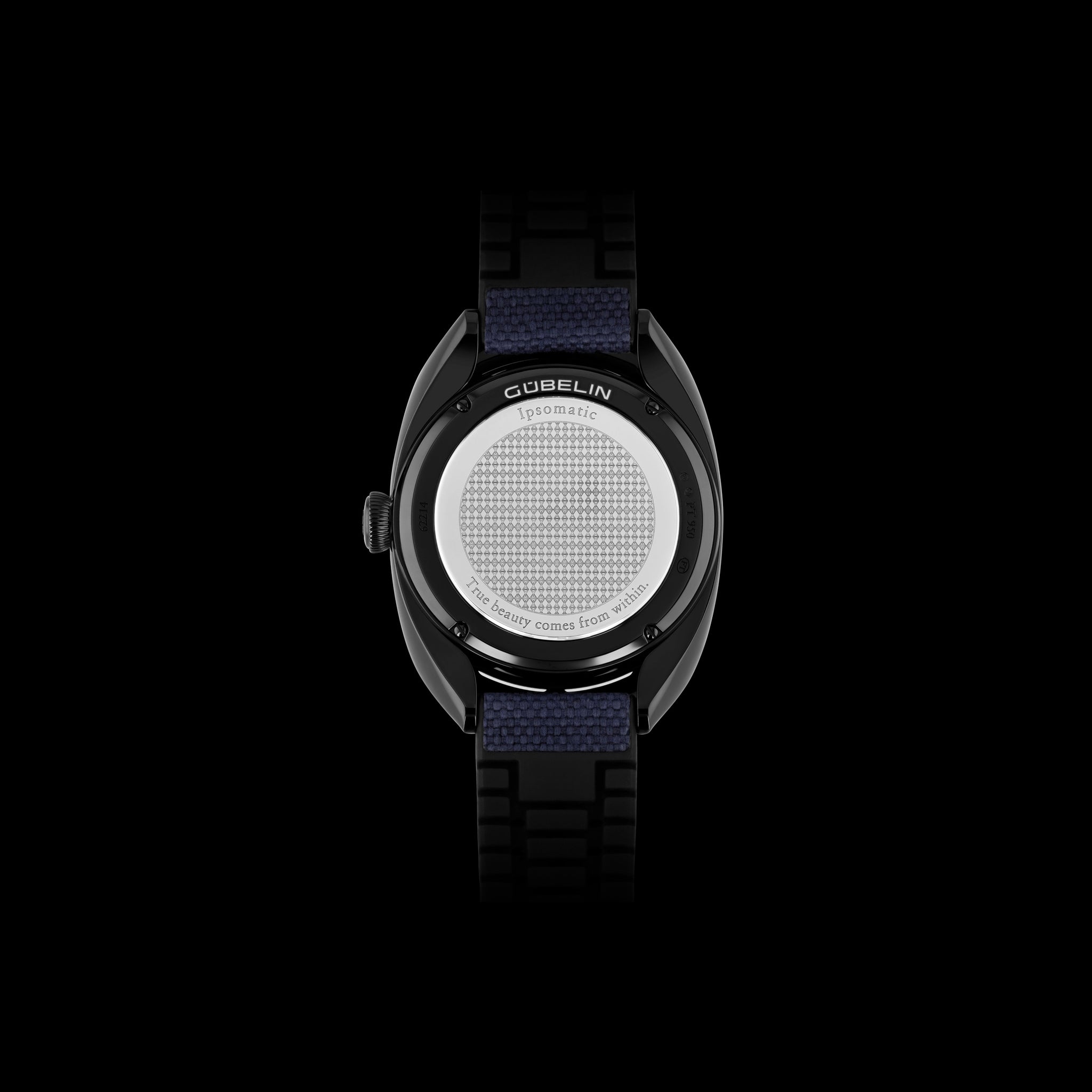 The Gübelin Ipsomatic, Black Edition, unites sculptural design with horological heritage. Its 39 mm black DLC-coated platinum case with wave-shaped lugs framing a purist opalin blue dial and sporty rubber-textile strap with platinum ruby-set buckle, while a curved engraved caseback and revived 1950s Felsa 1560 Bidynator movement discreetly honour the wearer, Swiss watchmaking tradition and the careful use of precious resources.